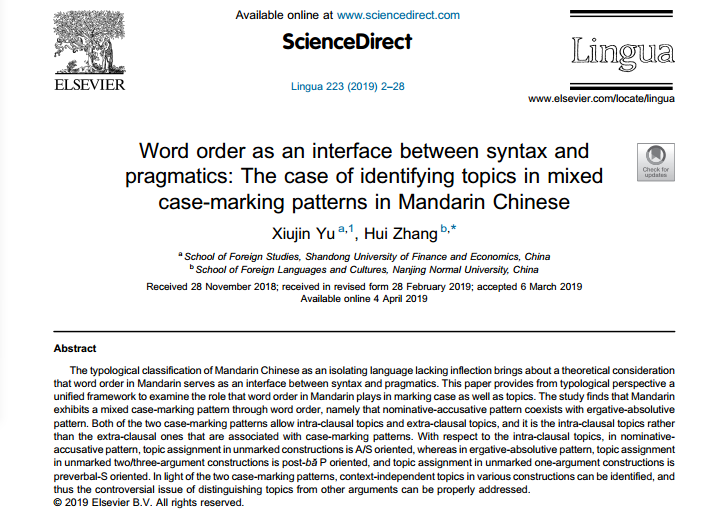 外国语学院于秀金教授作为第一作者的论文《Word order as an interface between syntax and pragmatics: The case of identifying topics in mixed case-marking patterns in Mandarin Chinese》于2019年5月正式发表在国际SSCI和A&HCI期刊《Lingua》上(223卷第2-28页)。该期刊是刊登理论语言学研究论文的国际顶级期刊之一,系我校特类期刊。
