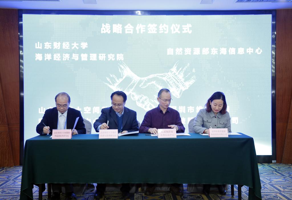 王邵军为汪同三颁发海洋经济与管理研究院名誉院长聘书和特聘教授聘书,赵忠秀为殷克东和关洪军颁发海洋经济与管理研究院院长和副院长聘书,陈晓兰为张晓峒、吴爱娜、龚茂珣、李广雪、吴克俭颁发山东财经大学特聘教授聘书。会上,海洋经济与管理研究院与国家海洋局东海信息中心、深圳市维度数据科技股份有限公司、山东省国土空间数据和遥感技术研究院签署了战略合作协议。