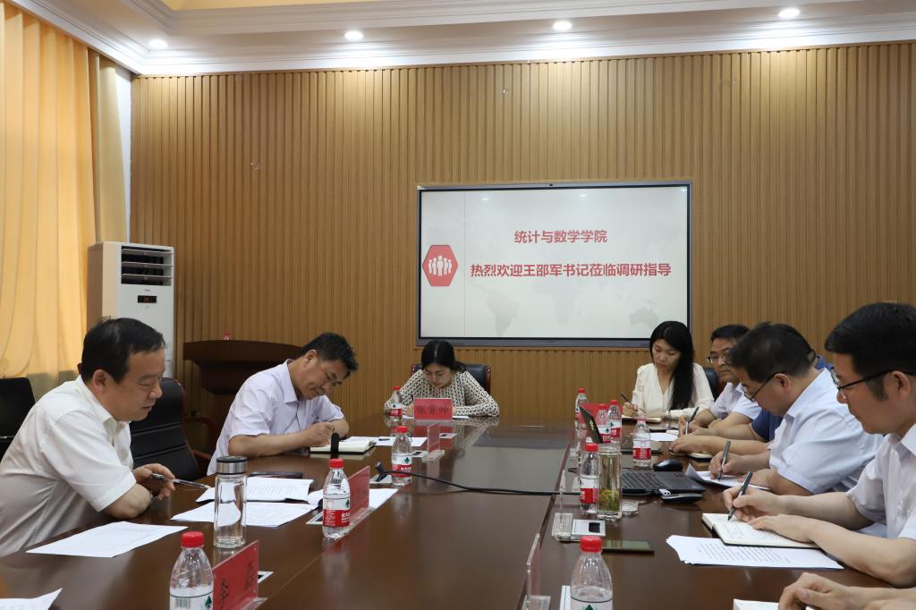 在统计与数学学院,王邵军认真听取工作汇报,对学院合并以来所取得的成绩给予充分肯定,对学院紧跟经济社会发展形势,通过交叉融合等方式凝练的随机优化与金融统计、数字经济统计核算、生物医学统计、环境与生态统计、智能大数据等科研团队和山东省新批设的山东省高校现代统计交叉科学重点实验室、黄河流域生态统计协同创新中心两个科研平台表示赞赏,并鼓励学院积极做好系统科学一级学科的申报工作。